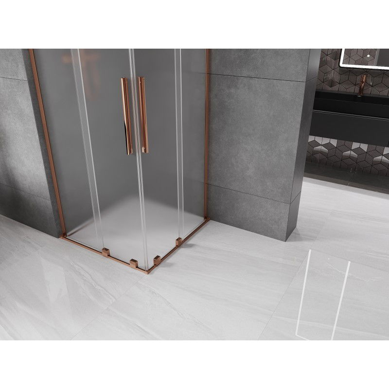 Specifikace produktu: Rozměr: 90x90 cm Výška: 200 cm Montáž: Univerzální Vstup: Posuvné dveře Barva skla: Mléčná Povrchová úprava: Růžové zlato Typ skla: Tvrzené Tloušťka skla: 8 mm Profil: Hliník Stabilizátor úhlu L: Nerezová ocel Povrchová úprava pro snadné čištění Vyrovnání nerovností stěny Nastavení šířky Možnost montáže na sprchovou vaničku nebo obklady Jednoduché válečky nejvyšší kvality Nerezová klika Sada těsnění pro odvod vody Hliníkový práh těsnění dveří