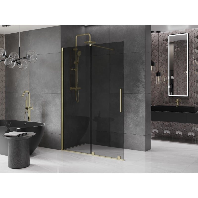 Specifikace produktu: Šířka: 130 cm Výška: 200 cm Montáž: Univerzální Barva skla: Grafit Povrchová úprava: Kartáčované zlato Typ skla: Tvrzené Tloušťka skla: 8 mm Profil: Hliník Konzola: Nerezová ocel Max. délka konzoly: 120 cm Povrchová úprava pro snadné čištění Vyrovnání nerovností stěny Nastavení šířky Možnost montáže na sprchovou vaničku nebo obklady Nerezová rukojeť Sada těsnění pro odvod vody Hliníkový práh těsnění dveří