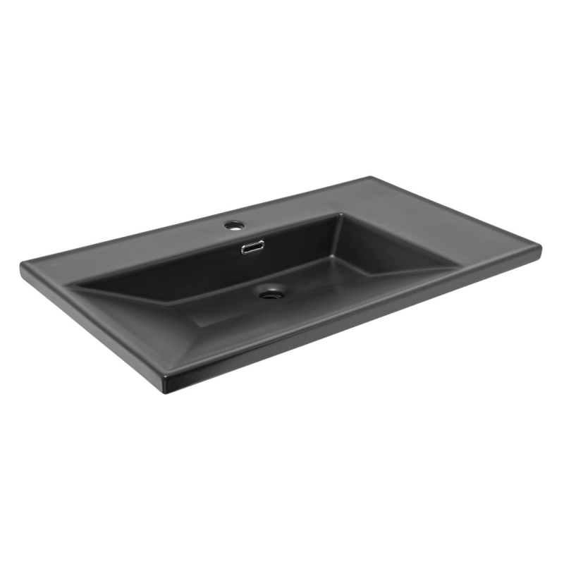 Nábytkové umyvadlo v černé barvě s otvorem pro baterii uprostřed a odkládací plochou vpravo. Šířka umyvadla 81 cm a hloubka 46 cm. Balení bez sifonu a baterie.