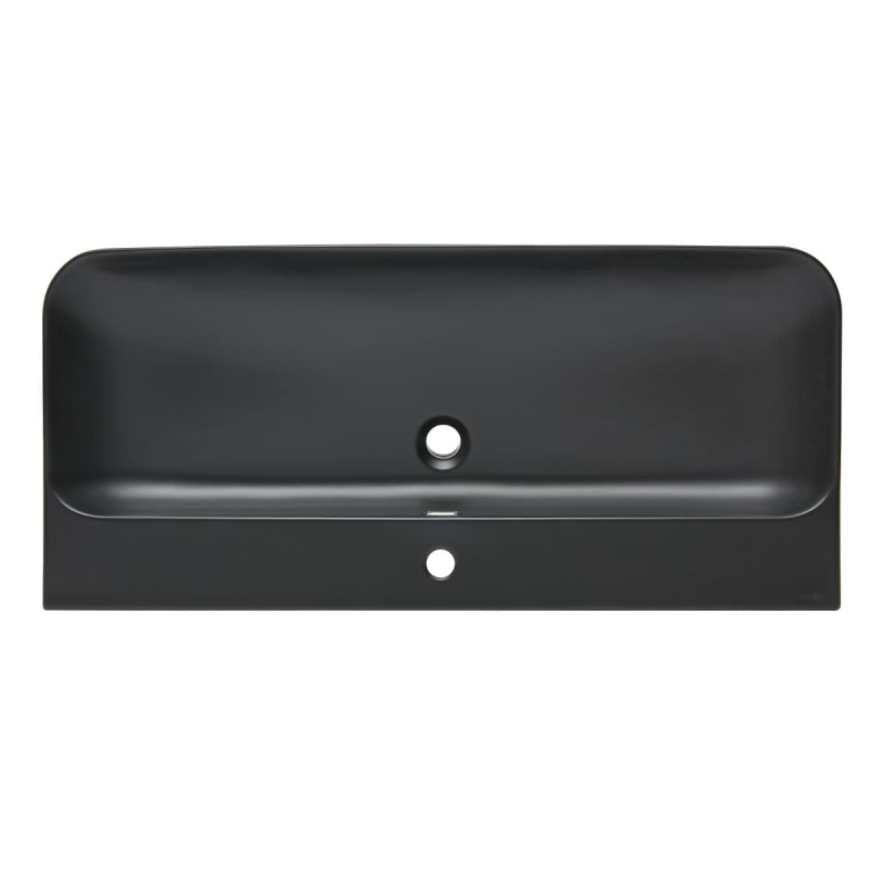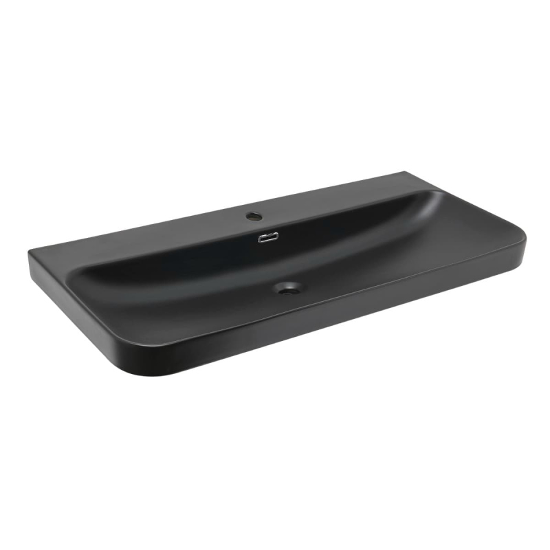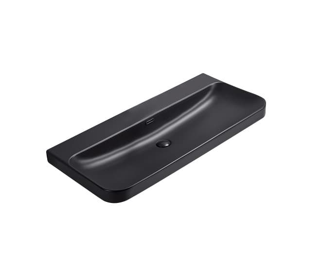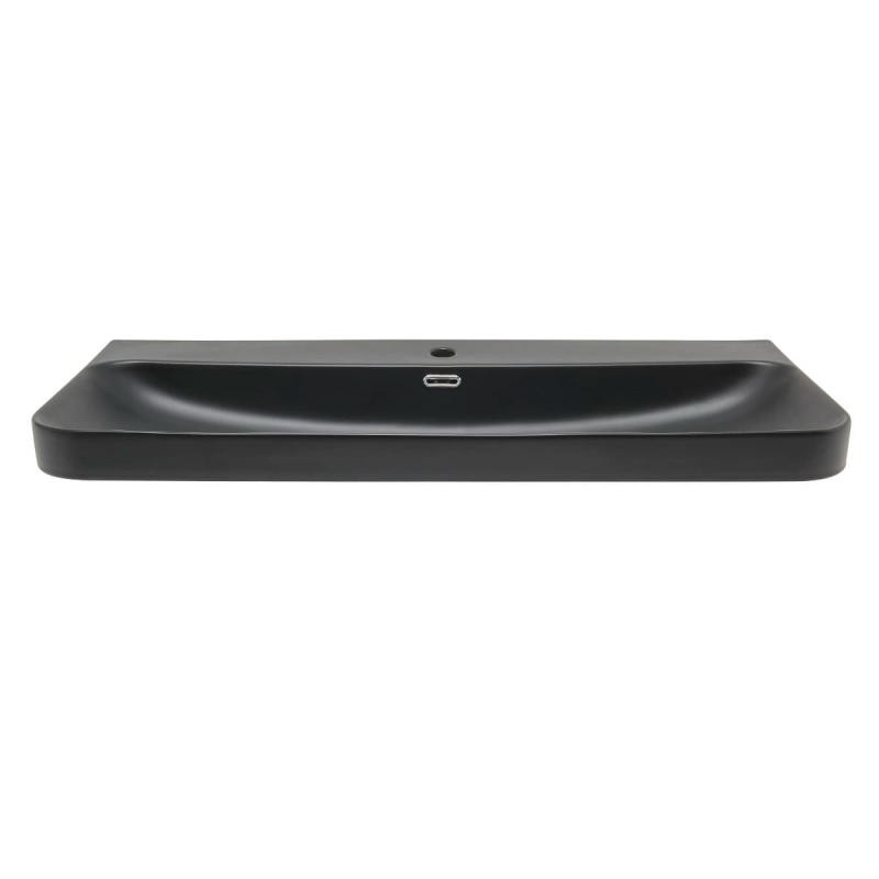 Nábytkové umyvadlo v černé matné barvě s otvorem pro baterii uprostřed o šířce 100,6 cm a hloubce 46,3 cm. Balení bez sifonu a baterie.
