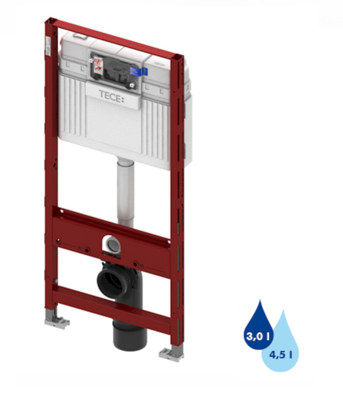 Nádržka TECE k závesnému WC do sadrokartónovej konštrukcie. Montážny prvok pre WC TECEprofil so splachovacou nádržkou TECE, ovládanie spredu, stavebná výška 1 120 mm. Na upevnenie do konštrukcie z profilových rúrok TECEprofil, alebo na inštaláciu do sadrokartónových profilov, drevených konštrukcií a na inštaláciu do rohu.