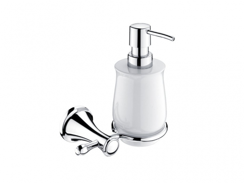Dávkovač na tekuté mýdlo. Nádobka glazovaná keramická. Úchyt mosaz-chrom . Pumpička plast-povrchová úprava chrom. Objem dávkovače 300 ml.