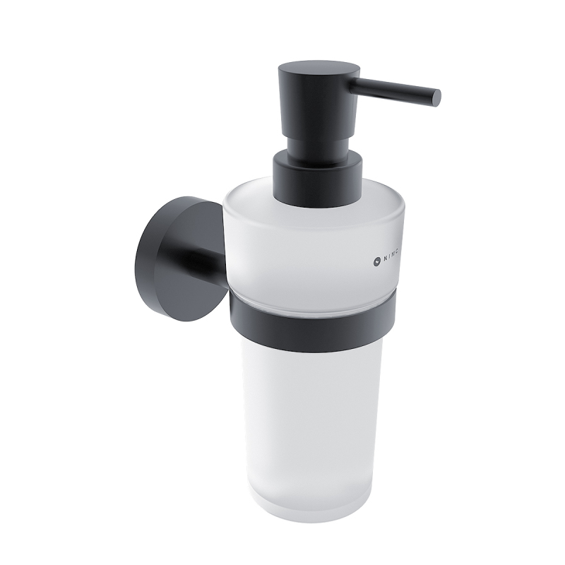Nástenný dávkovač na tekuté mydlo. Nádobka z matného sklo. Pumpička mosadz/čierna matná. Objem 250 ml.