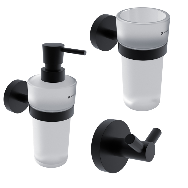 Súprava kúpeľňových doplnkov k umývadlu. Nástenný dávkovač tekutého mydla, držiak zubných kefiek a dvojháčik na zavesenie uterákov zo série kúpeľňových doplnkov Nimco Unix čierny.