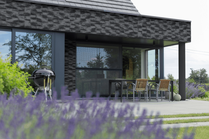 Mrazuvzdorné. Obklad vo farebnom prevedení antracit av imitácii kameňa a hrúbke 20 mm s reliéfnym povrchom. Vhodné do interiéru aj exteriéru.