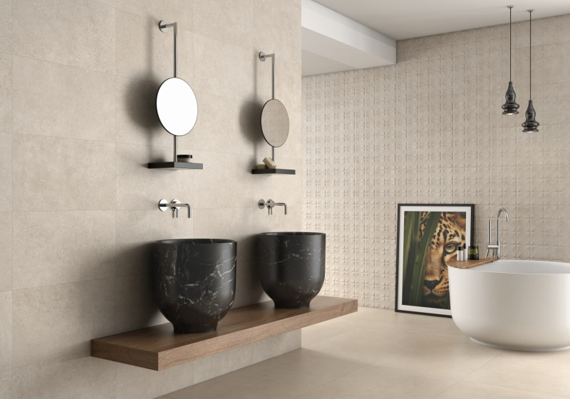 Obklad vo farebnom prevedení marfil av dizajne cementu s matným povrchom. Vhodné iba do interiéru.
