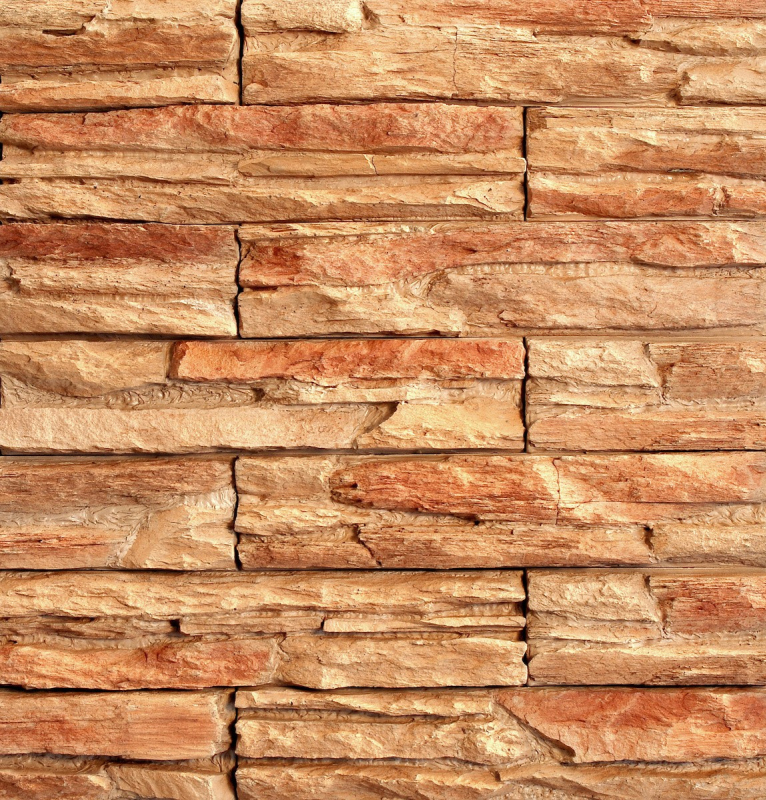 Kamenný obklad z betónu svojim vzhľadom a štruktúrou verne imituje prírodný kameň v oranžovej farbe o rozmere 8,6x38,8 cm.