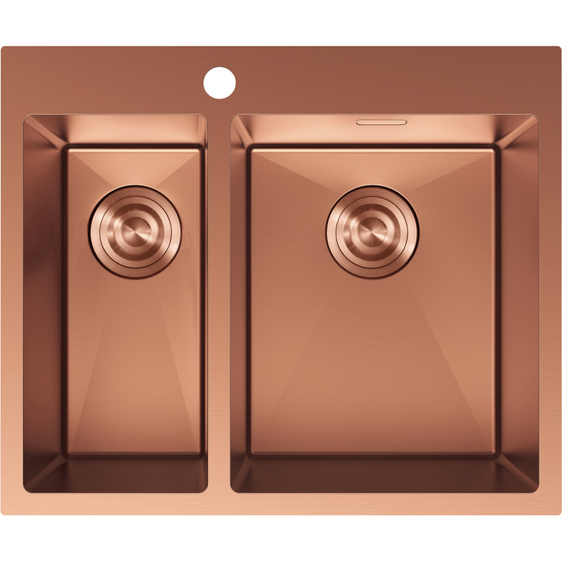 Špecifikácia produktu: Rozmer: 610x510x200 mm Hĺbka drezu: 200 mm Rozmery drezu: 410x335 mm (väčšie), 410x200 mm (menšie) Hrúbka oceľového okraja: 3 mm Hrúbka oceľového okraja drezu: 1 mm Polomer zao ø92 mm Typ: 1,5palcový drez Typ: Zapustený Materiál: Nerezová oceľ AISI 304 Farba: Meď Povrch: Hladký Povrchová úprava sifónu: Meď Prepadový otvor: Áno Otvor pre batériu: Áno Ručný sifón s odpadkovým košom a zátkou Prídavný kryt odtoku drezu Odolnosť voči nárazom, poškriabaniu a zmene farby Odolnosť voči vysokým teplotám a tepelným šokom Ľahko čistiteľný povrch