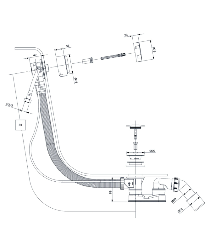 Omnires CGS napúšťacia armatúra s odtokom a prepadom, leštená meď TK132-PLUS-3.76+64-SCP
