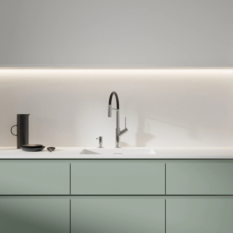 Dávkovač tekutého mydla, navrhnutý tak, aby pozdvihol každodenné rituály ako v kuchyni, tak v kúpeľni, ponúka dokonalú rovnováhu medzi funkčnosťou a štýlom. Pomáha udržiavať poriadok a zároveň zaisťuje pohodlie a flexibilitu usporiadania. Jeho všestranná inštalácia – či už na pracovnej doske, umývadle alebo kuchynskom dreze – poskytuje plnú voľnosť v dizajne. Dávkovač je starostlivo zladený s farebnými úpravami OMNIRES, ktorý sa bezproblémovo integruje do vášho interiéru, zatiaľ čo jeho ergonomický dizajn zaručuje rýchly a bezproblémový prístup k mydlu alebo prostriedku na umývanie riadu kedykoľvek je to potrebné.