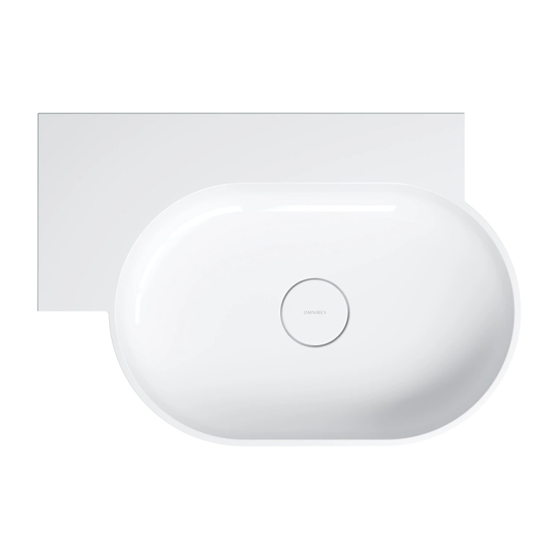 Umývadlo z kolekcie OMNIRES OVO sa vyznačuje minimalistickou a expresívnou siluetou s bezchybnými proporciami. Dizajn, zrodený z hravého prístupu ku geometrii, kombinuje dva protiľahlé polkruhy misy s obdĺžnikovou, funkčnou poličkou – ideálny priestor na inštaláciu batérie aj na odloženie kozmetiky či iných nevyhnutností dennej potreby. Harmonicky tvarované steny končia plochým okrajom, ktorý zdôrazňuje tvar umývadla, zatiaľ čo dokonale zladený kryt odtoku zaručuje bezchybnú estetiku. Diskrétne, továrensky vyrobené podrezané body na spodnej strane označujú, kde je možné vyrezať otvory pre batériu alebo dávkovač, čo umožňuje flexibilné prispôsobenie armatúr individuálnym potrebám.