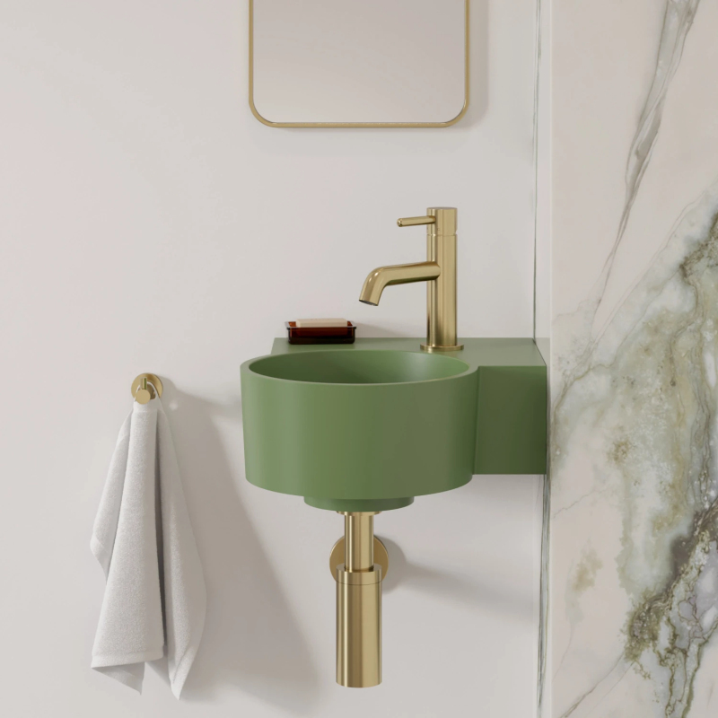 Umývadlo OVO v olivovej farbe (RAL6003) má zamatovo matný povrch v expresívnom tmavo zelenom odtieni.