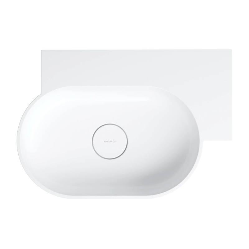 Umývadlo z kolekcie OMNIRES OVO sa vyznačuje minimalistickou a expresívnou siluetou s bezchybnými proporciami. Dizajn, zrodený z hravého prístupu ku geometrii, kombinuje dva protiľahlé polkruhy misy s obdĺžnikovou, funkčnou poličkou – ideálny priestor na inštaláciu batérie aj na odloženie kozmetiky či iných nevyhnutností dennej potreby. Harmonicky tvarované steny končia plochým okrajom, ktorý zdôrazňuje tvar umývadla, zatiaľ čo dokonale zladený kryt odtoku zaručuje bezchybnú estetiku. Diskrétny, továrensky vyrobený podrezaný bod na spodnej strane označuje, kde je možné vyrezať otvor pre batériu.