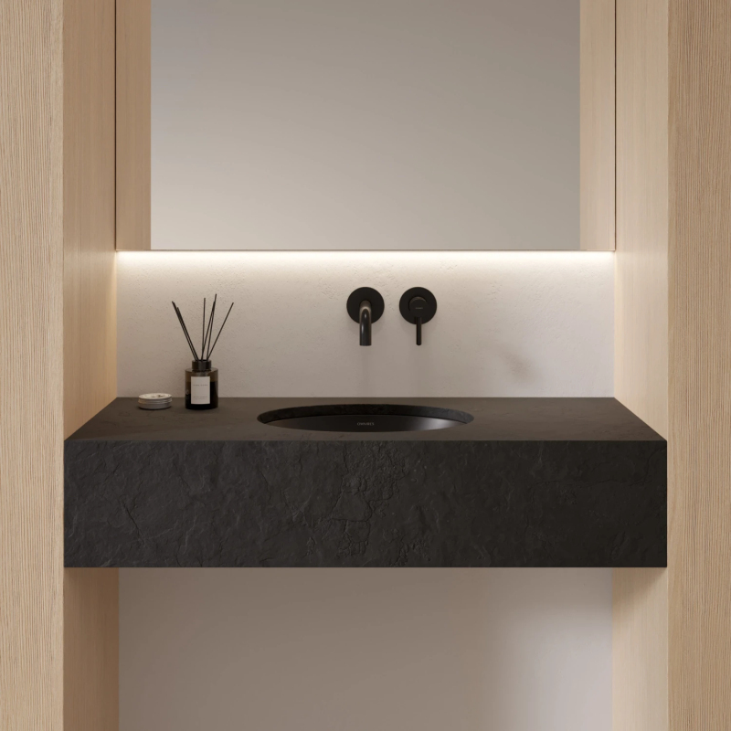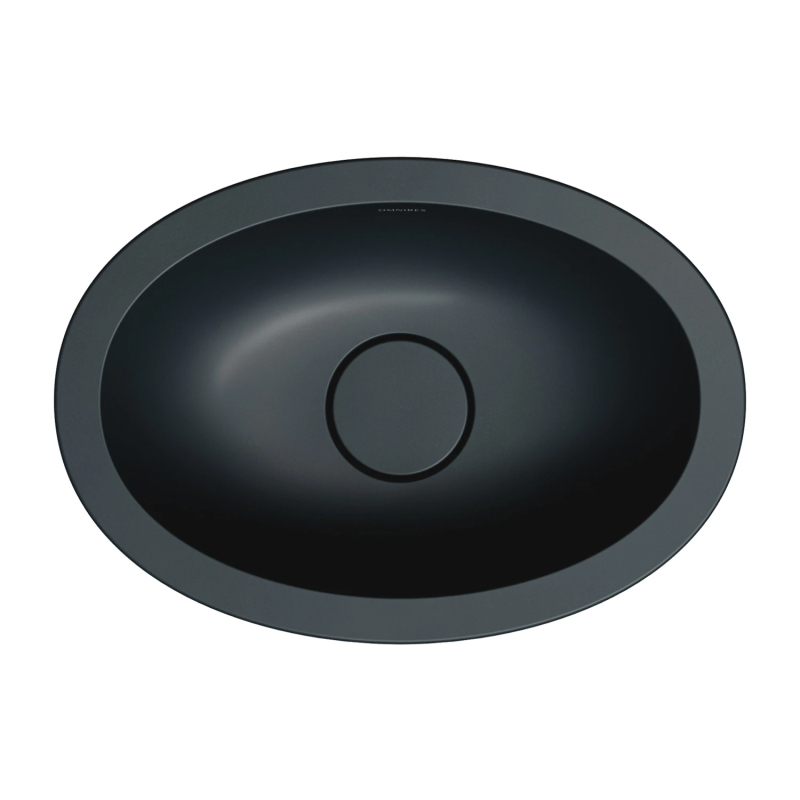 Umývadlo SHELL v čiernej lávovej farbe (RAL9005) má hodvábne hladký matný povrch v dramatickom odtieni čiernej.