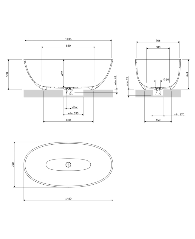 Omnires SHELL M+ voľne stojaca vaňa, 148 x 75 cm, matná biela SHELL148WWBM
