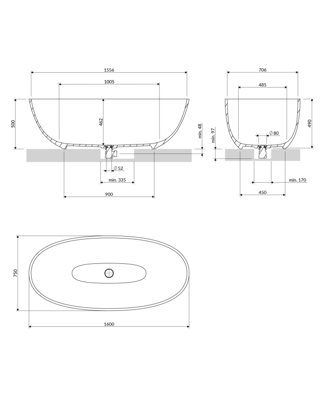 Omnires SHELL M+ voľne stojaca vaňa, 160 x 75 cm, popolová šedá SHELLWWAG