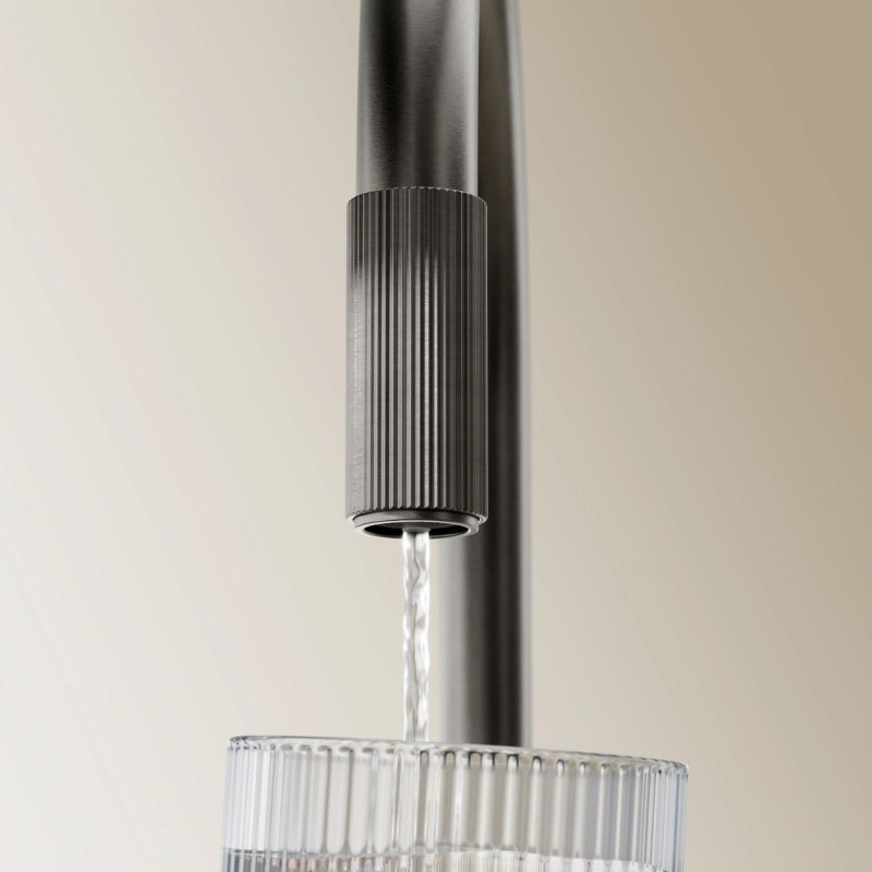 Kuchynská batéria SWITCH kombinuje minimalistický dizajn, ktorý vychádza z vyvážených proporcií, s praktickou funkčnosťou, ktorá poskytuje bežnú aj filtrovanú vodu. Jasne definované a precízne spracované detaily umožňujú intuitívne použitie smerovaním do dvoch oddelených prúdov vody: bežnej vody blízko páky a filtrovanej vody na konci výtoku – stačí otočiť rebrovaným krúžkom výtoku a rýchlo si naplníte pohár lahodne čerstvou pitnou vodou. Otočný vyťahovací výtok ďalej vylepšuje funkčnosť kuchynskej batérie a ponúka dlhší dosah a voľnosť pohybu okolo drezu. Zjednodušuje oplachovanie, umývanie a napúšťanie a zároveň umožňuje dôkladné čistenie celej pracovnej plochy.
