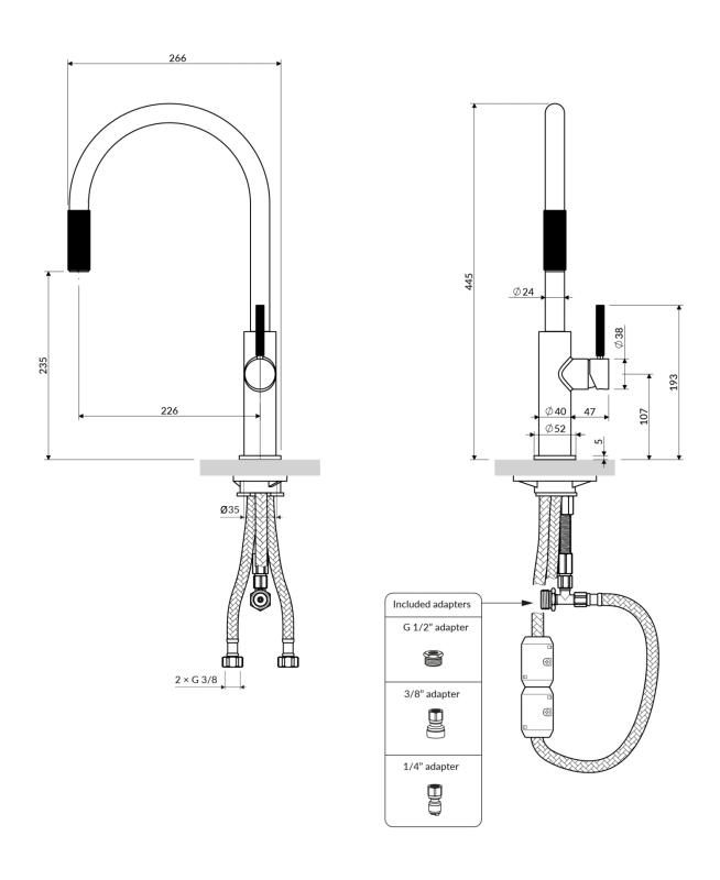 - Dodáva sa s konektormi na pripojenie filtračného systému vo veľkostiach G 1/2", 3/8", 1/4"