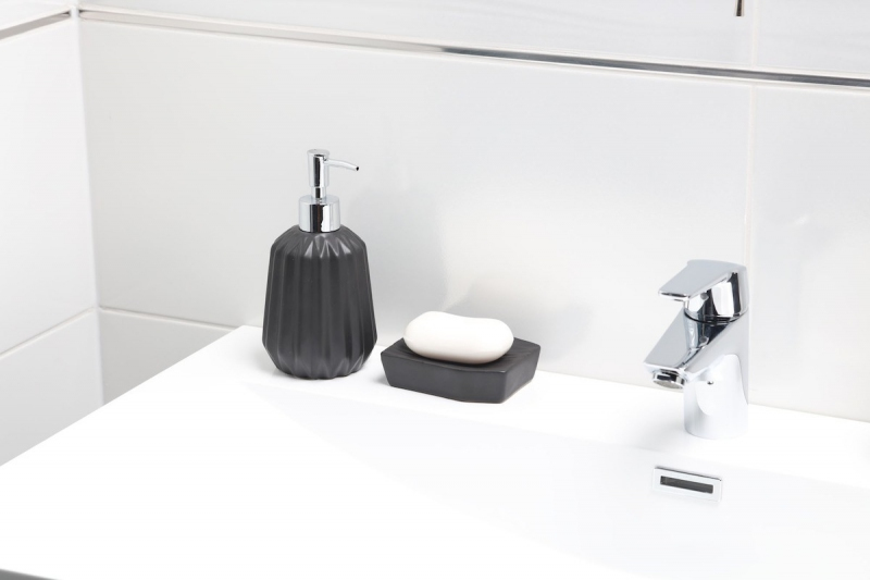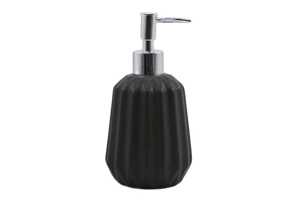 Keramický dávkovač mýdla o rozměrech 9 x 18 cm v černé barvě.