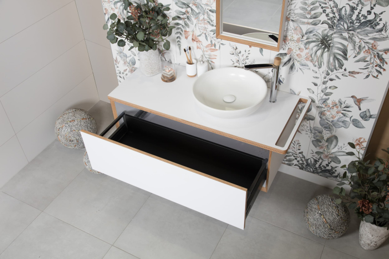 Kúpeľňová skrinka pod umývadlo na dosku v bielej farbe s matným povrchom a kombináciou celobukovej preglejky Multiplex.