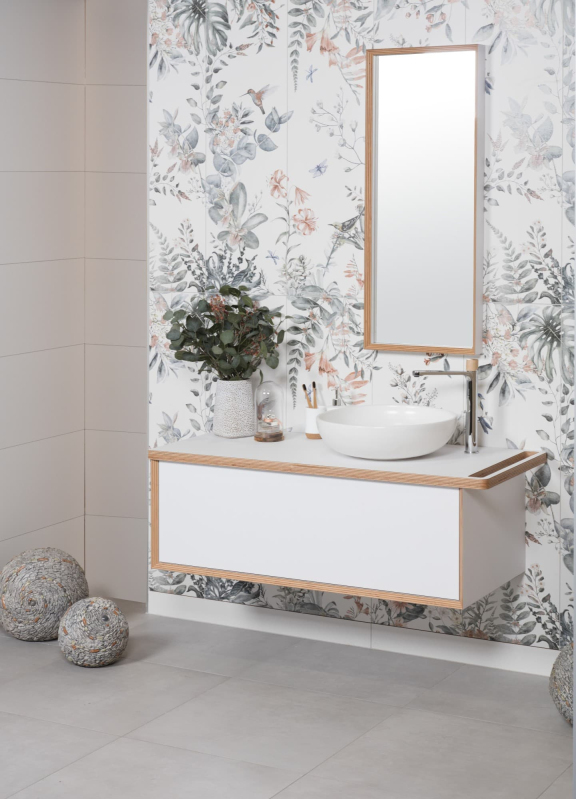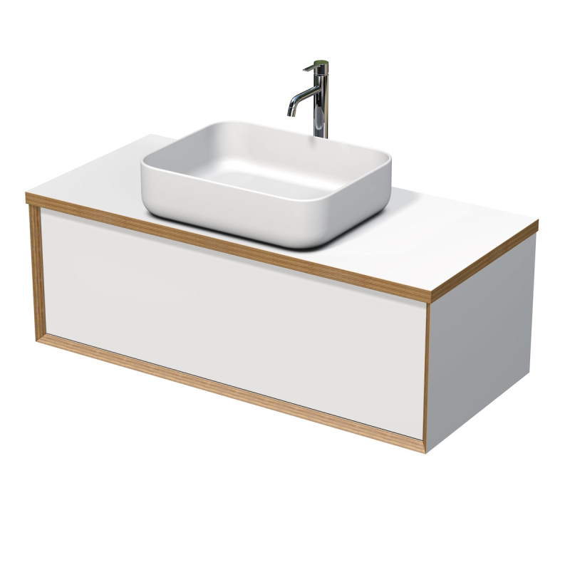 Kúpeľňová skrinka pod umývadlo v bielej farbe s matným povrchom v kombinácii s priznanými celobukovými hranami Multiplex.