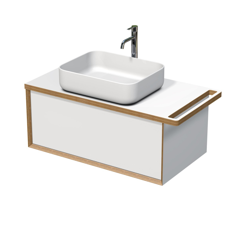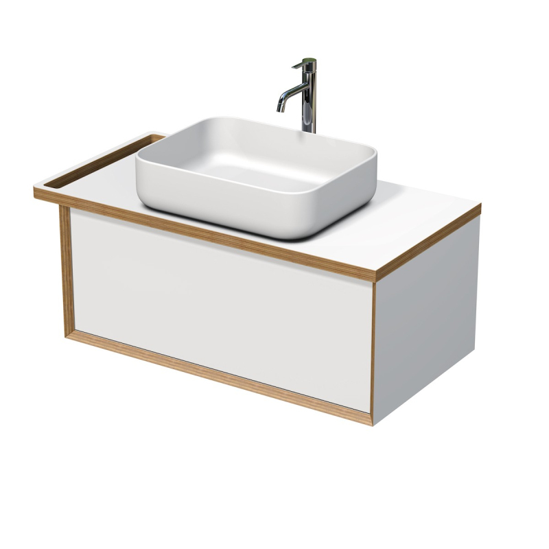 Kúpeľňová skrinka pod umývadlo na dosku v bielej farbe s matným povrchom a kombináciou celobukovej preglejky Multiplex.