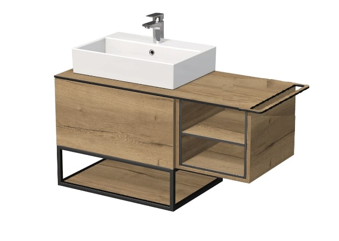 Závesná kúpeľňová skrinka pod umývadlo z vysoko odolného materiálu Compact v medenom dekore o rozmere 110x58x50 cm. Povrch v prevedení vodeodolné lamino.