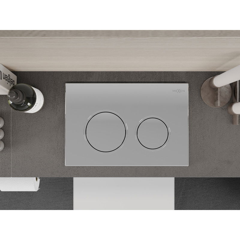 Špecifikácia produktu: Vhodné pre pneumatický rám: Mexen Fenix Air XS-F - 6A800, Fenix Air XS-U - 6A850 Farba: Leštený chróm Materiál: Plast Mechanizmus: Pneumatický 2 splachovacie okruhy Aktivuje sa stlačením spredu