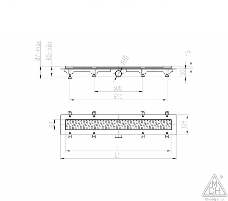 Podlahový linear. žľab 550 mm,bočný D40,klasik/floor lesk CH 550 K