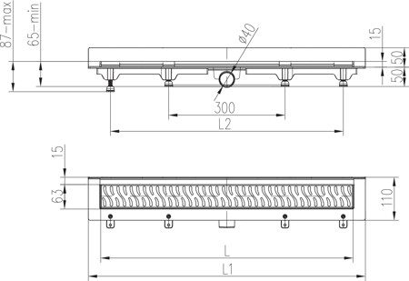 Podlahový linear. žľab k stene čierny 650 mm, bočné D40, Drops čierna CH 650 DC 2