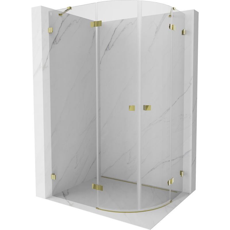 Špecifikácia produktu: Rozmer: 90x70 cm (ľavé dvere 90 cm, pravé dvere 70 cm) Výška: 200 cm Polomer zakrivenia R55 Strana montáže: Ľavá Vchod: Dvere s výklopnými krídlami Farba skla: Priehľadná Povrchová úprava: Zlatá Profil: Hliník Typ skla úprava pre ľahké čistenie Možnosť nastavenia šírky Dva montážne systémy: - s profilom, ktorý umožňuje vyrovnanie nerovností stien - bez profilu pre dokonale rovné steny Možnosť montáže na sprchovú vaničku alebo obklady Mechanizmus na zdvíhanie a spúšťanie dverí Mosadzné svorky a pánty v jednej rovine so sklenenou tabuľou Magnetický prúžok a elastomér