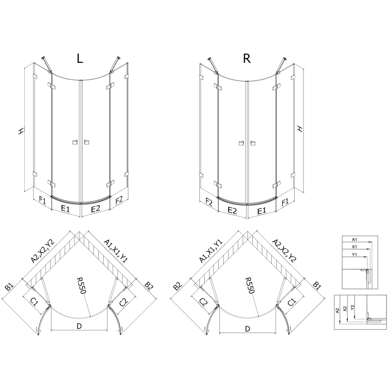 Špecifikácia produktu: Rozmer: 90x80 cm (pravé dvere 90 cm, ľavé dvere 80 cm) Výška: 200 cm Polomer zakrivenia R55 Strana montáže: Pravá Vchod: Dvere s otočnými pántami Farba skla: Priehľadná Povrchová úprava: Kartáčovaná šedá Profil: Hliník Typ skla úprava pre ľahké čistenie Možnosť nastavenia šírky Dva montážne systémy: - s profilom, ktorý umožňuje vyrovnanie nerovností stien - bez profilu pre dokonale rovné steny Možnosť montáže na sprchovú vaničku alebo obklady Mechanizmus na zdvíhanie a spúšťanie dverí Mosadzné svorky a pánty v jednej rovine so sklenenou tabuľou Magnetický prúžok a elastomér