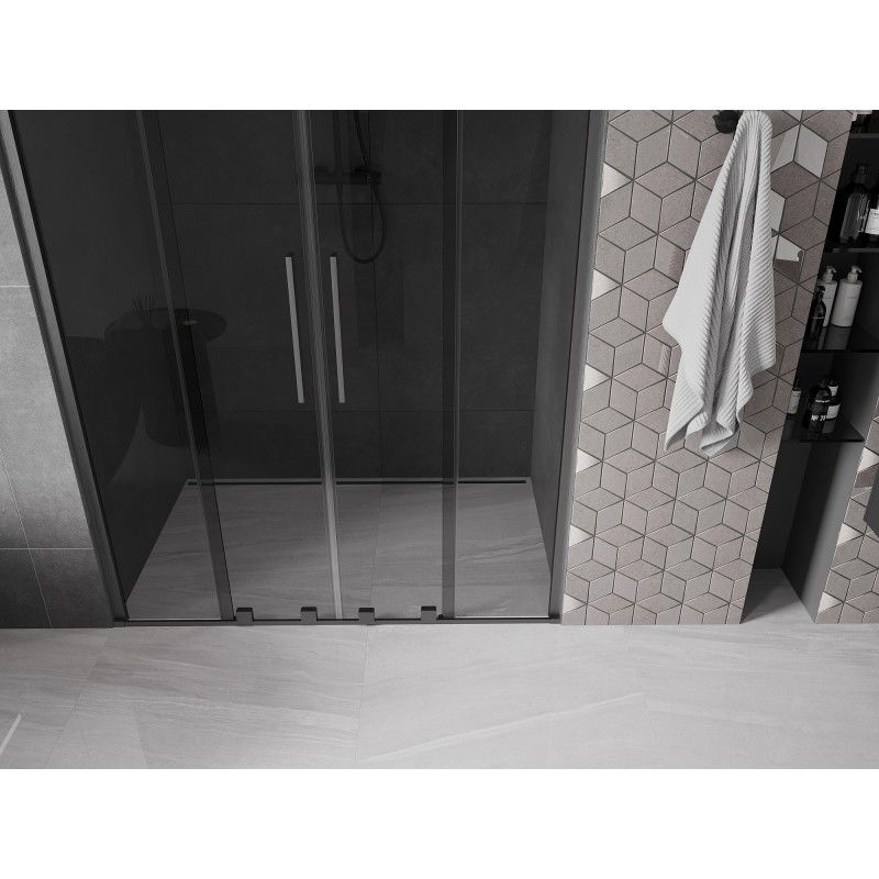Špecifikácia produktu: Rozmer: 140x200 cm Montáž: Univerzálny Vchod: Posuvný Farba skla: Grafit Typ skla: Tvrdené Hrúbka skla: 8 mm Profil: Hliník Povrchová úprava: Kartáčovaná pištoľovo sivá Povlak pre ľahké čistenie Vyrovnanie nerovností steny Nastavenie šírky Možnosť montáže na sprchovú Hliníkový prah na tesnenie dverí