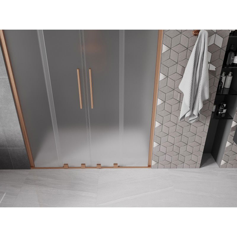 Špecifikácia produktu: Rozmer: 140x200 cm Montáž: Univerzálny Vchod: Posuvný Farba skla: Mliečna Typ skla: Tvrdené Hrúbka skla: 8 mm Profil: Hliník Povrchová úprava: Kartáčovaná meď Povlak pre ľahké čistenie Vyrovnanie nerovností steny Nastavenie šírky Možnosť montáže na sprchovú vaničku Hliníkový prah na tesnenie dverí