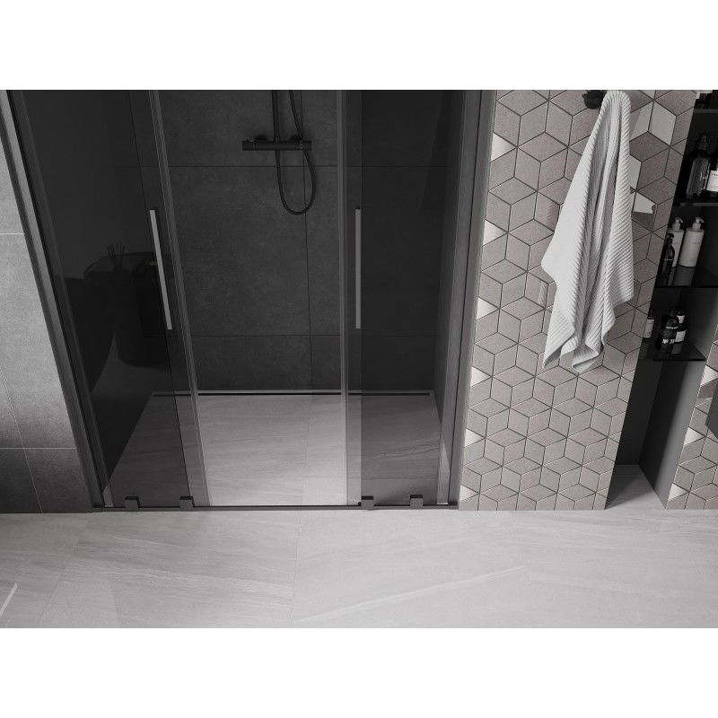 Špecifikácia produktu: Rozmer: 150x200 cm Montáž: Univerzálny Vchod: Posuvný Farba skla: Grafit Typ skla: Tvrdené Hrúbka skla: 8 mm Profil: Hliník Povrchová úprava: Kartáčovaná pištoľovo sivá Povlak pre ľahké čistenie Vyrovnanie nerovností steny Nastavenie šírky Možnosť montáže na sprchovú vody Hliníkový prah na tesnenie dverí