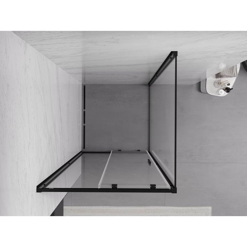 Špecifikácia produktu: Rozmer: 90x90 cm (dvere 90 cm, stena 90 cm) Výška: 200 cm Montáž: Univerzálny Vstup: Posuvné dvere Farba skla: Priehľadná Povrchová úprava: Čierna Typ skla: Tvrdené Hrúbka skla: 6 mm Profil: Hliník Povlak vaničku alebo obklady Kovová rukoväť Sada tesnení na odvod vody Hliníkový prah na tesnenie dverí