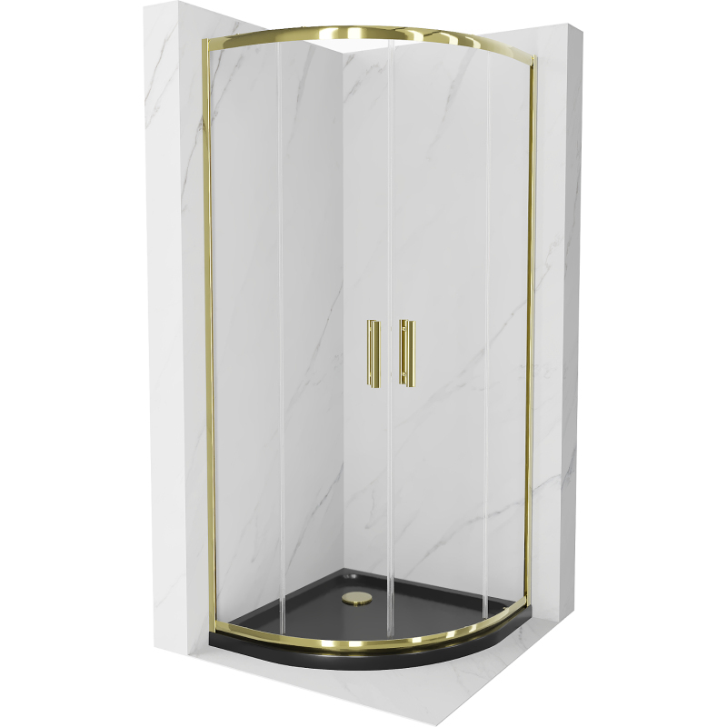 Půlkruhový sprchový kout Mexen Rio 90 x 90 cm, průhledný, zlatý + plochá sprchová vanička, černá - 863-090-090-50-00-4170G