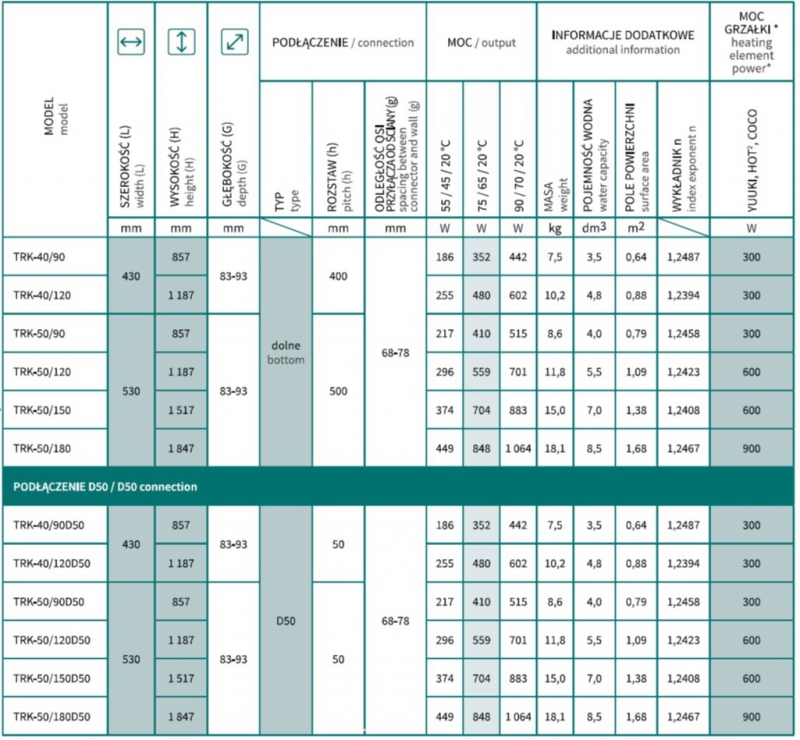 Dostupné rozmery radiátora TRICK: