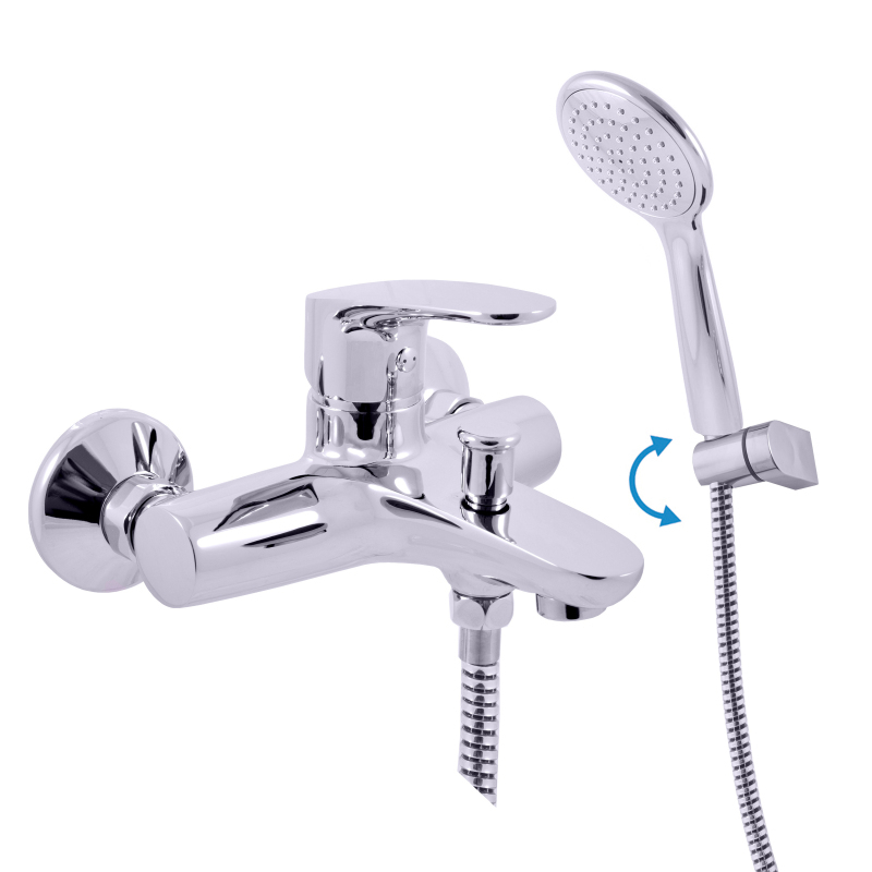 Vodovodná batéria vaňová nástenná so sprchou a otočným držiakom.