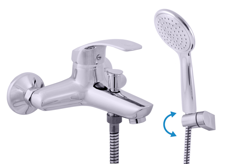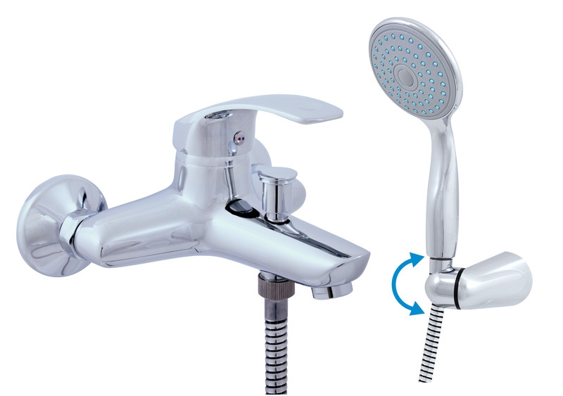 Vodovodná batéria vaňová nástenná so sprchou a otočným držiakom.