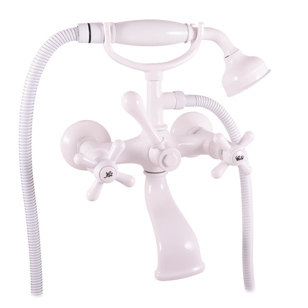 Vodovodná batéria vaňová nástenná s vidlicou na odkladanie sprchy a so sprchou.