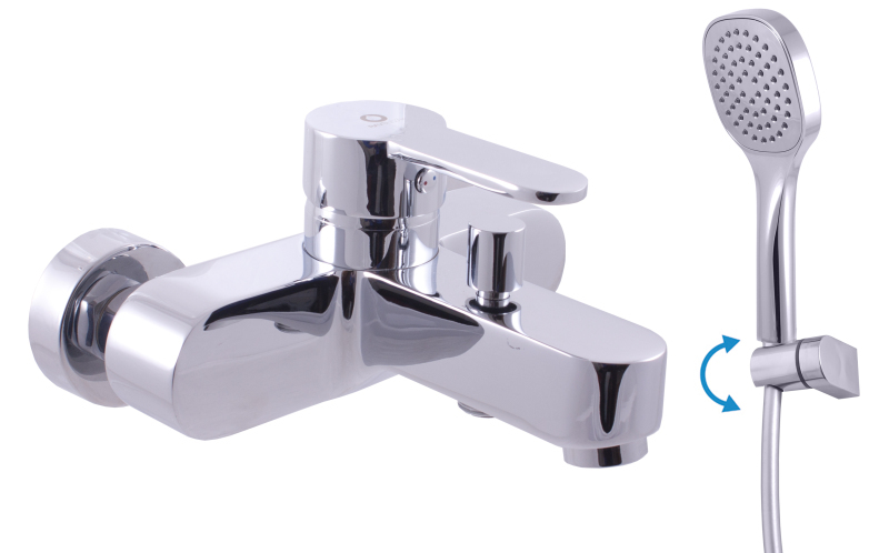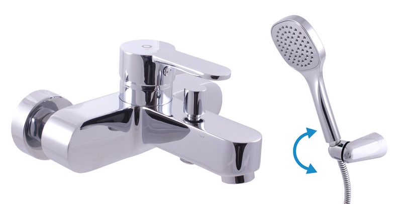 Vodovodná batéria vaňová nástenná so sprchou a otočným držiakom.