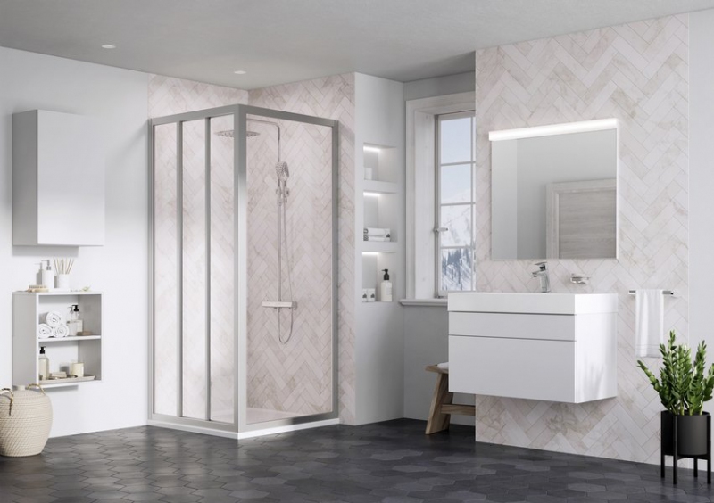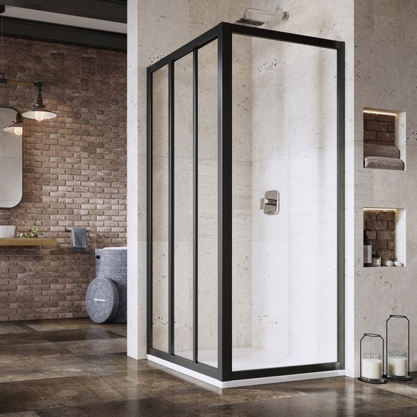 Sprchový kút rohový vzniknutý spojením sprchových dverí a pevnej steny. Prevedenie rámu: biela/satin/čierna, výplň z umelej hmoty: pearl, výplň z bezpečnostného skla: transparent/grape, výška výrobku 1980 mm. Zobraziť viac