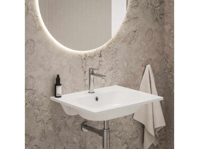 Nábytkové tenkostenné umývadlo Chrome Slim z liateho mramoru na inštaláciu na stenu alebo na zapustenie do závesnej skrinky Chrome, s prepadom. Biele prevedenie.