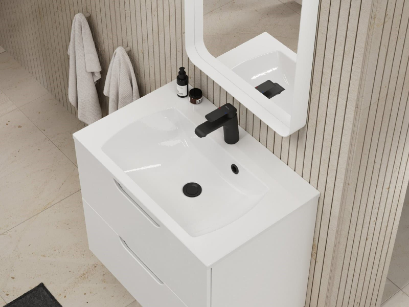 Nábytkové tenkostenné umývadlo z liateho mramoru Classic Slim na inštaláciu na stenu alebo na zapustenie do závesnej skrinky, s prepadom. Biele prevedenie.