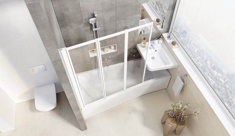 Praktická a univerzálna. Pozostáva z troch pohyblivých dielov, ktoré je možné úplne zložiť do vnútorného priestoru vane. Vhodná pre obdĺžnikové vane, ale prispôsobí sa aj výnimočnému tvaru asymetrickej vane BeHappy II a umožní pohodlné sprchovanie v najmenších kúpeľniach.