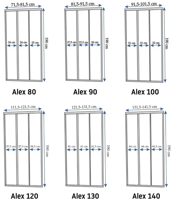 Drzwi prysznicowe Alex to najlepšie połączenie estetyki łazienkowej aj komfortu kąpieli. Są one wykonane z najwyższej akości szkła hartowanego aj posiadają nowoczesną powłokę EasyClean. Drzwi Alex składają się z jednego elementu nieruchomego oraz dwóch elementów przesuwnych. Docelowo kierunek drzwi je prawostronny. W celu zmiany kierunku drzwi na lewostronne należy w elemencia ruchomym skrajnym, z wystającą listwą w formie klamki, odkręcić pionowe profile aj przełożyć je na drugą strone szyby. CAD