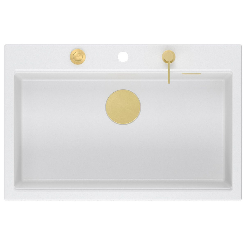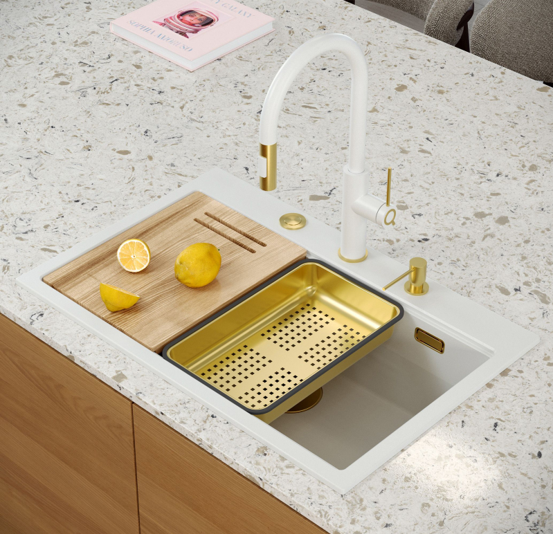 Granitový drez so svojim minimalistickým, moderným vzhľadom hodí do aranžmánu každej kuchyne. Hlboká a priestranná komora zaisťuje vysoký komfort používania. Drez, ktorý ponúkame, je skvelou voľbou pre zákazníkov, ktorí ocenia kvalitu a spracovanie. Nadčasový tvar, použitie prvotriednych materiálov a technológií, skvelý dizajn a kompatibilita použitých riešení zaručujú dokonalý konečný výsledok a vyplnia každý kuchynský priestor. K dispozícii sú rôzne farebné varianty. Tento model je veľmi bohato vybavený doplnkovými kuchynskými doplnkami. Drez je dodávaný s dávkovačom tekutín, bambusovou doskou, odkvapkávačom a valcovanou oceľovo-silikónovou podložkou (nie je súčasťou sady v zlatej a medenej variante).
