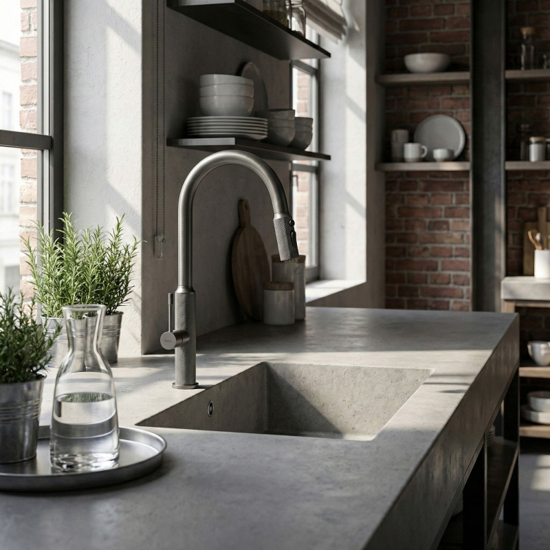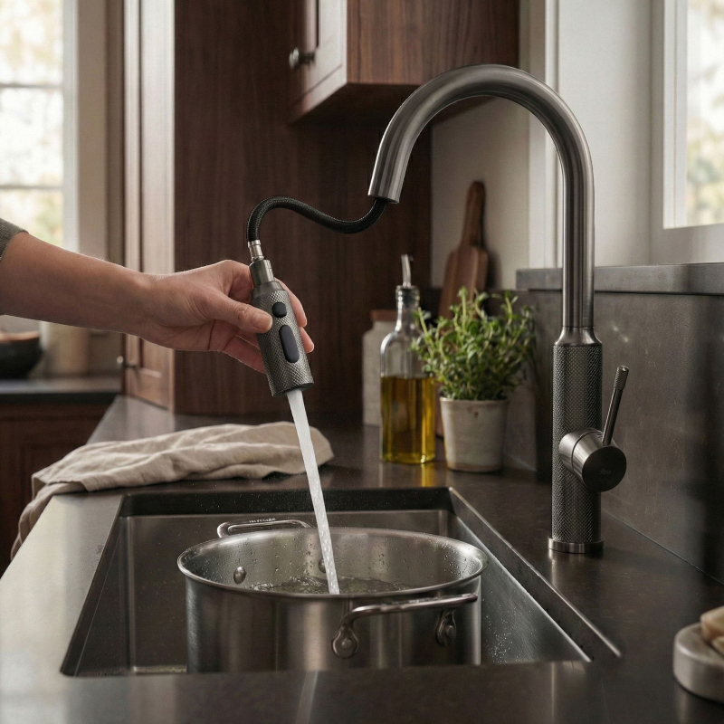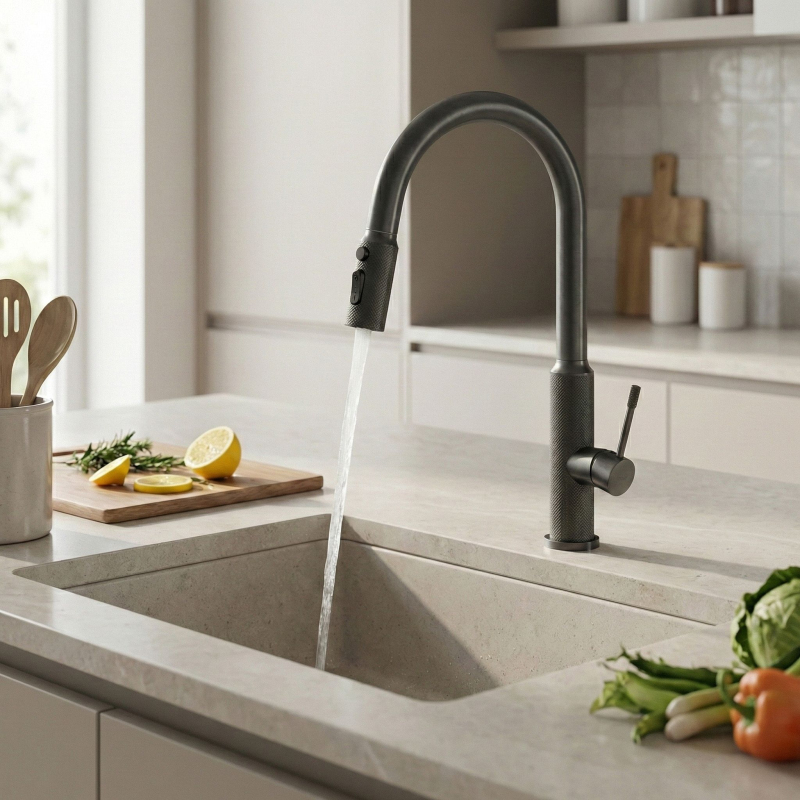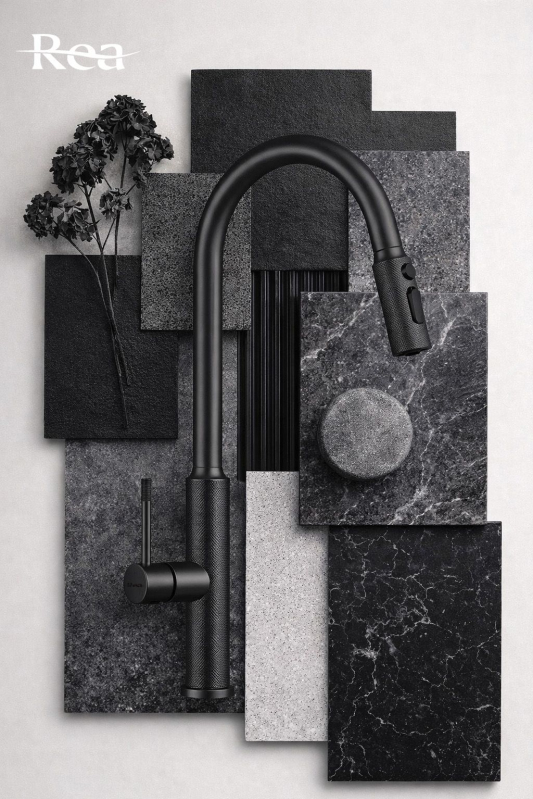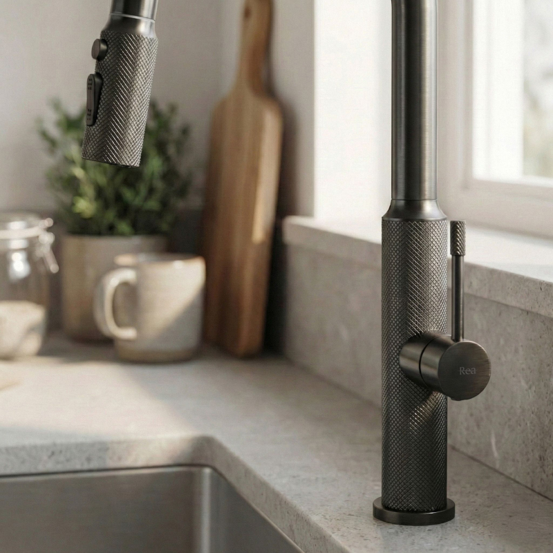 Zmodernizujte zónu umývania riadu s kuchynskou batériou Rea Master. Tento model spája surový, technický dizajn s vysokou ergonómiou práce. Pevné mosadzné telo je zakončené grafitovým odtieňom, vďaka čomu ide o odolné riešenie pre moderné kuchyne. Povrch Titanium – batéria má efektnú tmavosivú farbu s kartáčovanou štruktúrou. Titánový odtieň je skvelou alternatívou ku klasickej čiernej či chrómu a dodáva interiéru hĺbku a moderný charakter. Technológia PVD – povrchová úprava bola nanesená metódou PVD, čo zaručuje mimoriadnu tvrdosť a odolnosť proti poškriabaniu i zmatneniu, aj pri intenzívnom používaní. Výsuvná výtoková hubica – flexibilná. Uľahčuje umývanie neštandardných nádob, dôkladné oplachovanie drezu i napúšťanie hrncov na pracovnej doske. Dva režimy prúdu - prepínač na hubicu umožňuje rýchlu zmenu režimu: z koncentrovaného súvislého prúdu na rozptýlený sprchový prúd, ideálne pri umývaní zelenej ruky a koncovku - ovládaciu páčku. Zvyšuje to industriálny vzhľad a zabraňuje kĺzaniu mokrej ruky pri ovládaní. Batéria Rea Master Titanium je voľbou pre tých, ktorí ocenia profesionálne riešenie aj doma. Titánová farba a technické detaily perfektne ladia s loftovými a minimalistickými interiérmi.