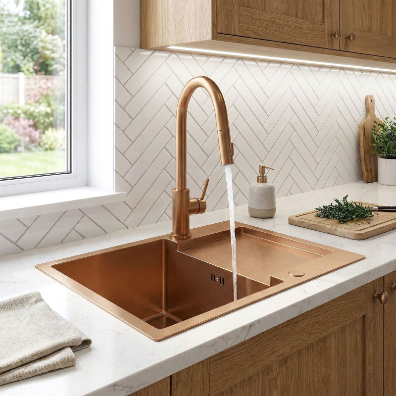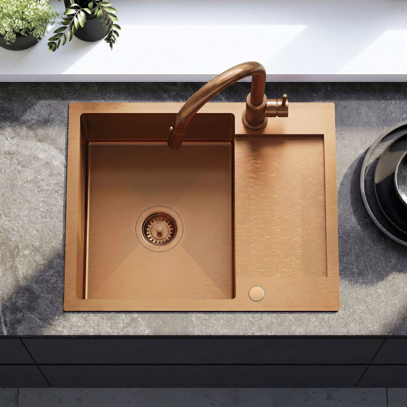 Oceľový drez Paul v prevedení brúsená meď spája moderný dizajn a praktickosť, vďaka čomu sa skvele hodí do každej kuchyne. Je vyrobený z vysoko kvalitnej nerezovej ocele AISI 304 (hrúbka 2 mm) a vyniká vysokou odolnosťou proti korózii, poškriabaniu aj vysokým teplotám, takže zostáva dlhodobo odolný a spoľahlivý. Hlboká, priestranná vaňa zaisťuje pohodlie pri každodennom používaní. Drez je vybavený otvorom pre batériu, čo umožňuje rýchlu a jednoduchú montáž armatúry. Produkt má odtok farebne zladený s povrchovou úpravou, vďaka čomu celok pôsobí jednotne a elegantne. Hygienický povrch a ľahké čistenie hladkých prvkov pomáhajú udržať drez v bezchybnom stave a obmedzujú možnosť rozvoja mikroorganizmov. Produkt je dostupný v dvoch variantoch: bez batérie alebo v sete s kuchynskou batériou Fresh s.